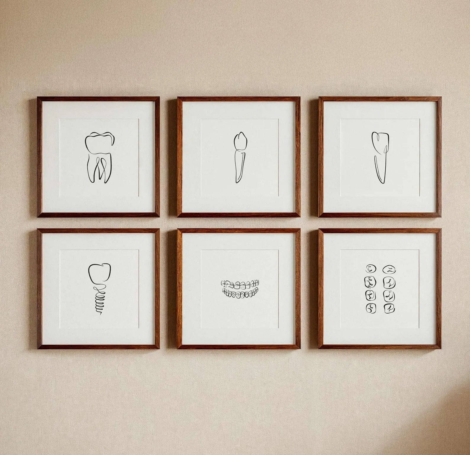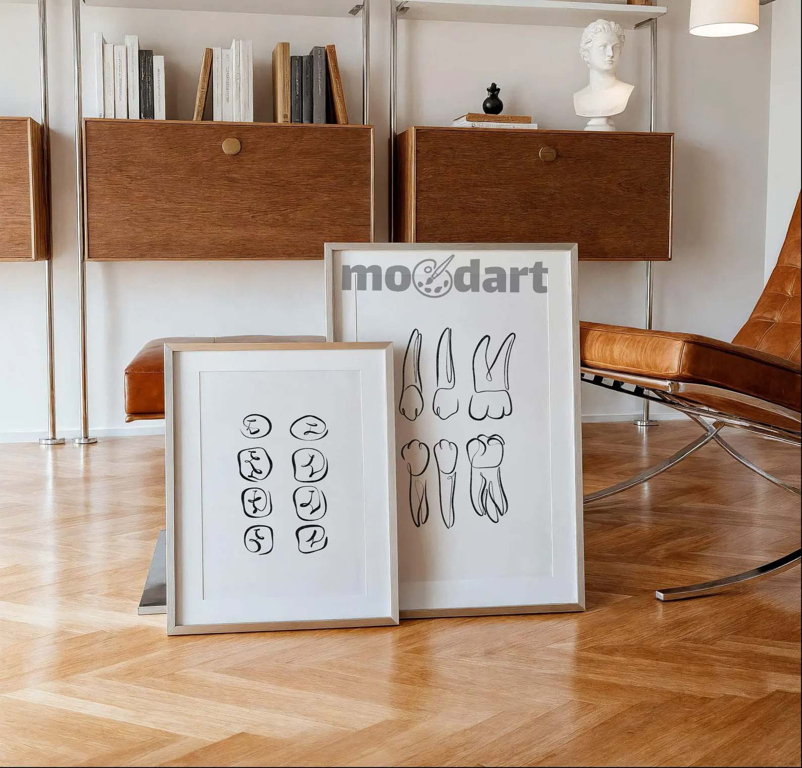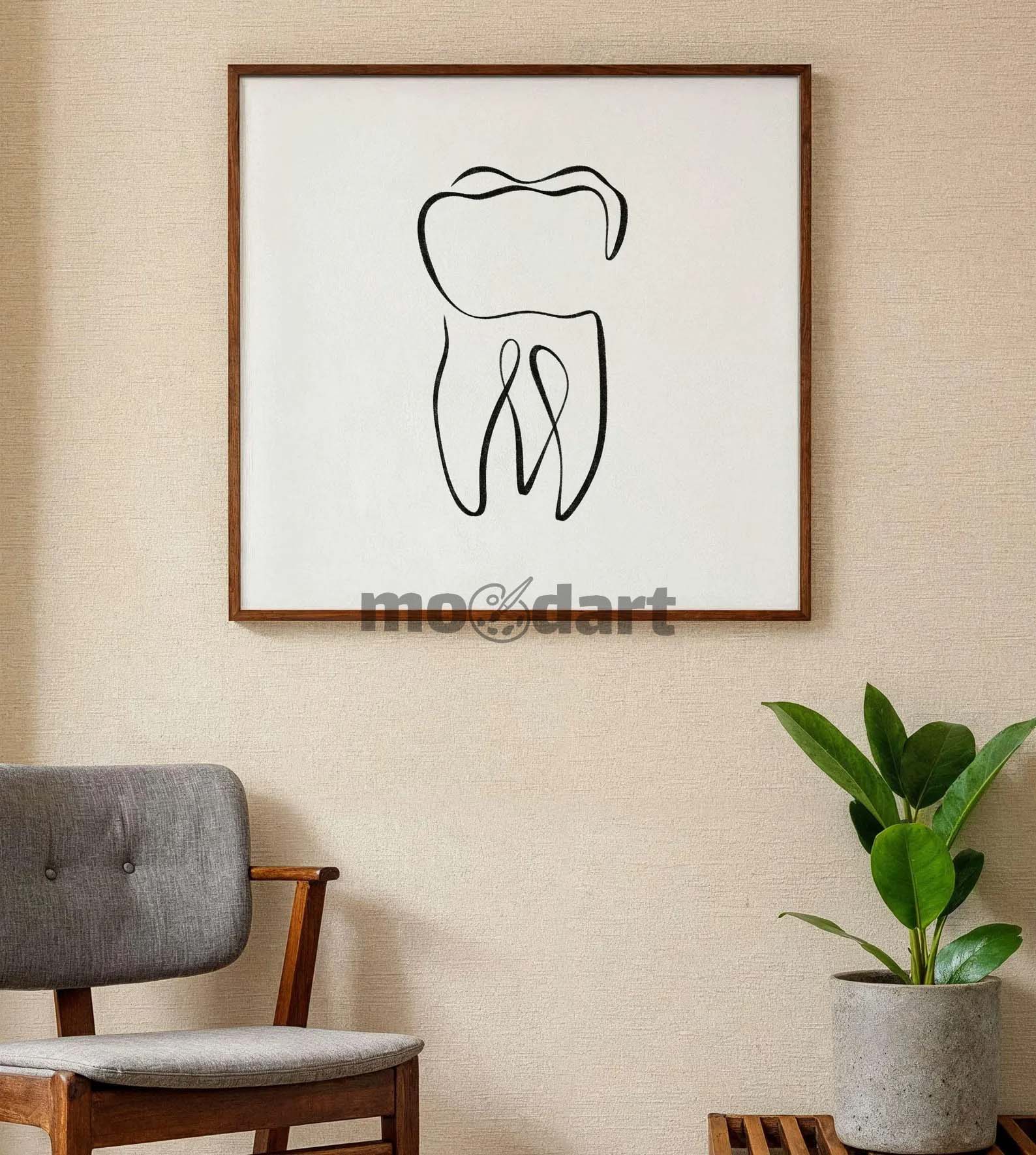 Apportez une touche artistique et minimaliste à votre cabinet dentaire ou à votre intérieur avec cette collection de posters dentaires au design épuré. Chaque illustration présente une dent stylisée en ligne continue, soulignant la beauté de la simplicité. Imprimés sur fond blanc avec des contours noirs, ces dessins sobres s’intègrent parfaitement dans une décoration moderne et professionnelle. Que ce soit pour une salle d’attente, un cabinet ou une salle de soins, ces affiches créent une atmosphère apaisante et élégante.